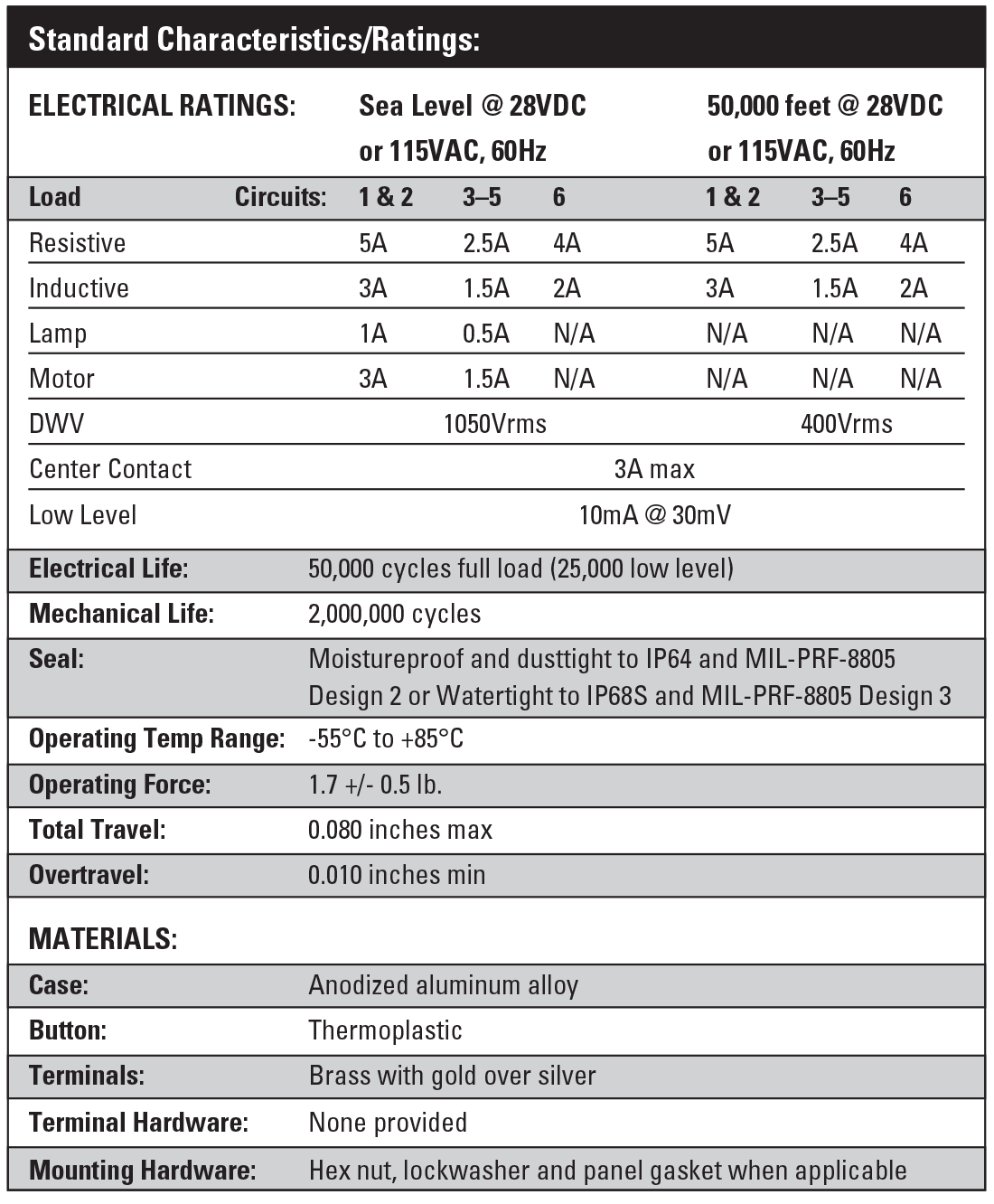 P7系列旨在满足MIL-PRF-8805的要求,包括低电平开关(10mA @ 30mV),以及在28伏直流电下高达5安培的功率开关。
