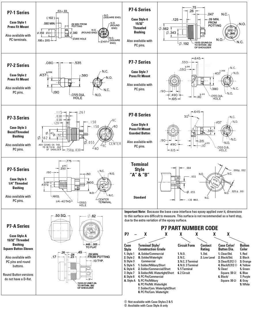 提供了多种安装方式,以适合应用。P7-1、P7-2、P7-7和P7-8外壳样式采用型锻衬套形状,允许在飞机飞行控制、手柄和类似应用中进行压配合安装。其他样式的特点是螺纹衬套安装。P7-3和P7-A外壳样式具有前面板边框,而P7-5和P7-6具有用于后面板安装的传统衬套。银色或黑色边框是标准配置。其他颜色可特别订购。