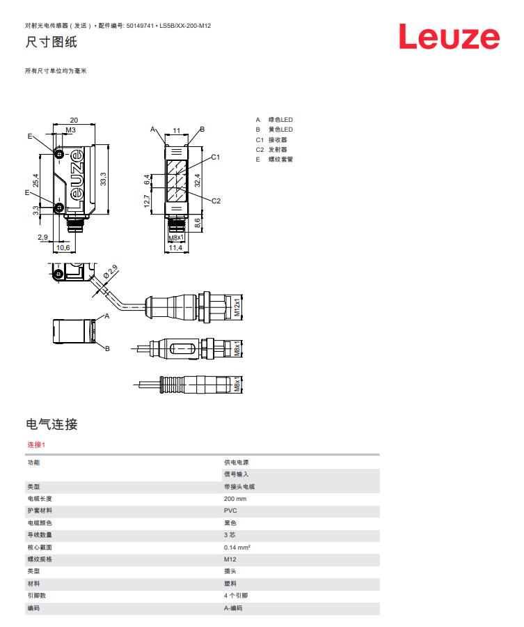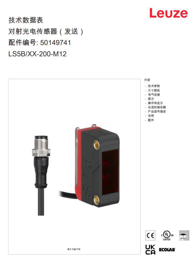 瑞士Leuze劳易测对射式光电传感器(发送)LS5B/XX-200-M12产品详情: