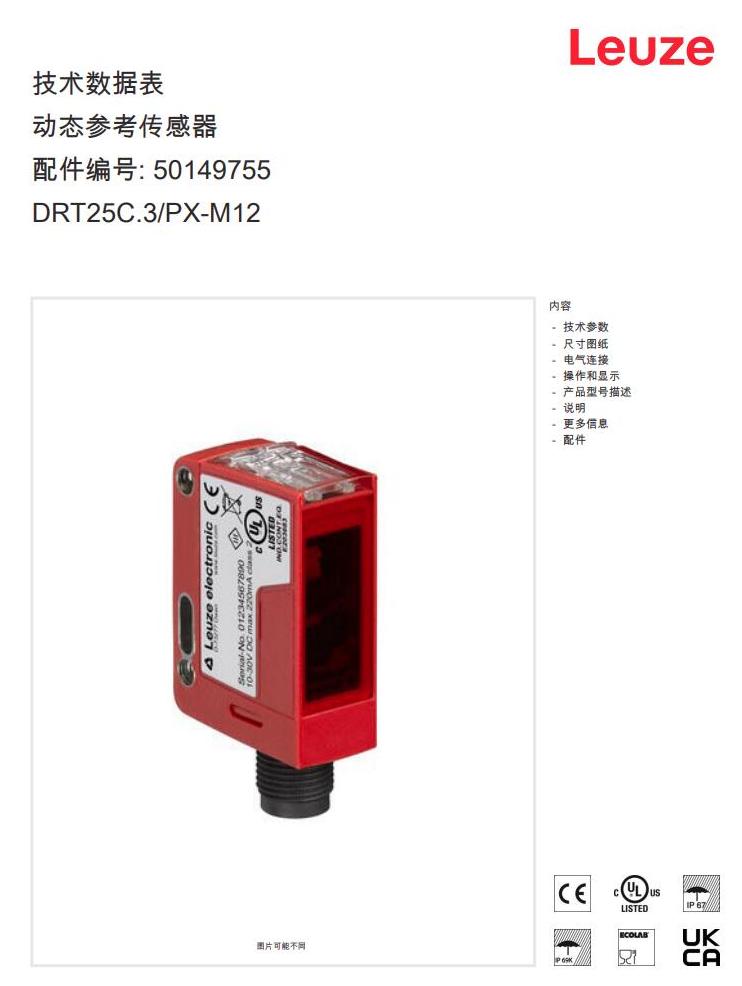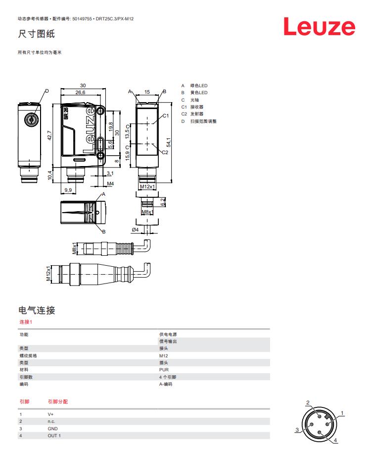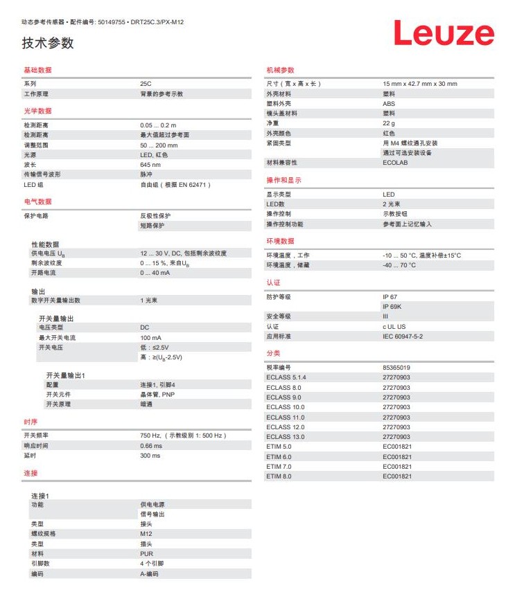 瑞士Leuze劳易测漫反射光电传感器DRT25C.3/PX-M12产品详情:
