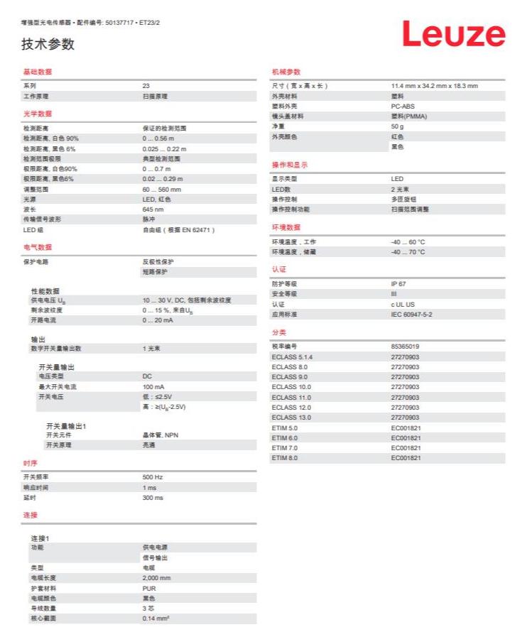 瑞士Leuze劳易测漫反射光电传感器ET23/2产品详情:
