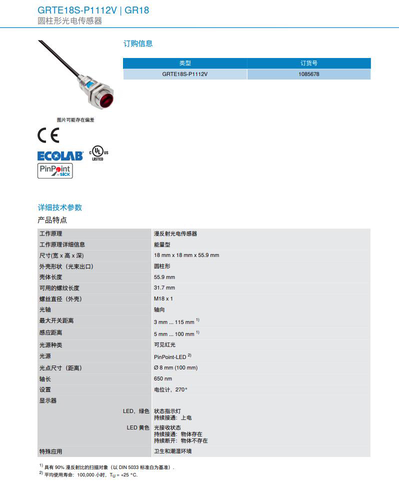 英国上市公司365进口分销德国SICK西克圆柱形光电传感器GR18系列等全系列产品,保证原装正品,可提供产品型号图片、参数、技术资料和详细信息。