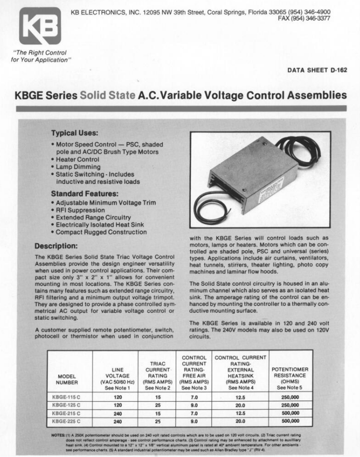 美国KB 可控硅风扇控制 底盘安装系列 KBGE-115C产品详情: