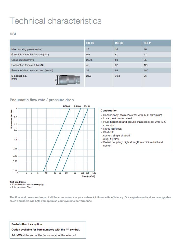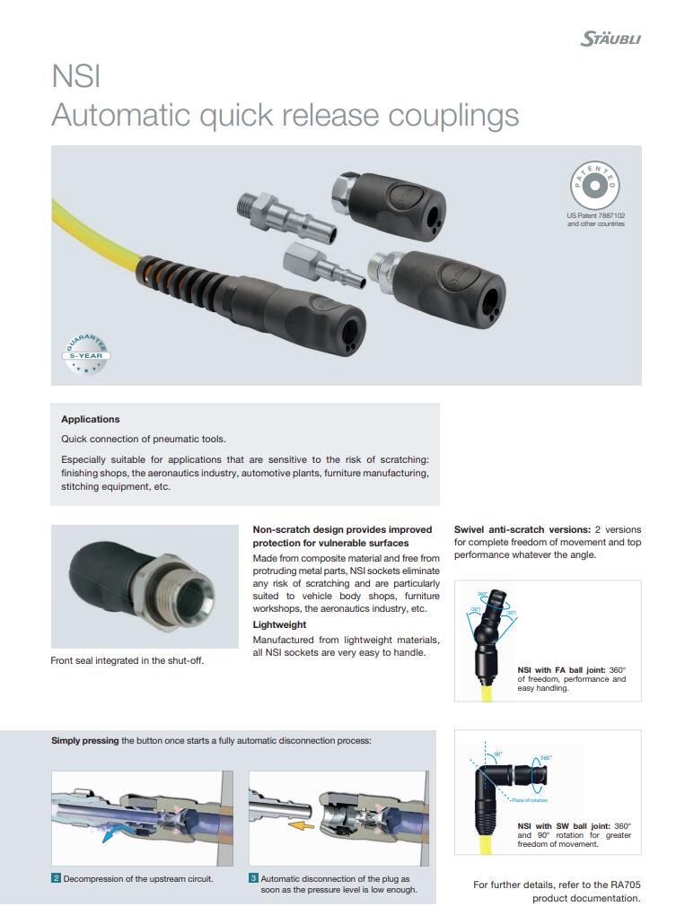 史陶比尔开发出三合一主动安全技术,消除了软管在压力下猛力反抽的危险。凭借这一技术,RSI 快速接头提供了绝对安全的解决方案来满足操作者要求最严苛的需求。RSI 快速接头比快速连接管接头更符合人体工学要求,为气动回路的连接提供真正高效的解决方案。RSI 压缩空气连接器符合 ISO 6150 C 连接插头系列标准。ISO 4414 断开齿隙预防标准。