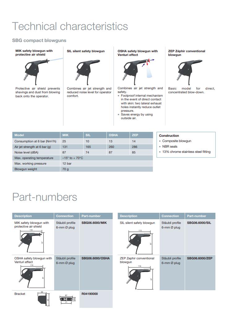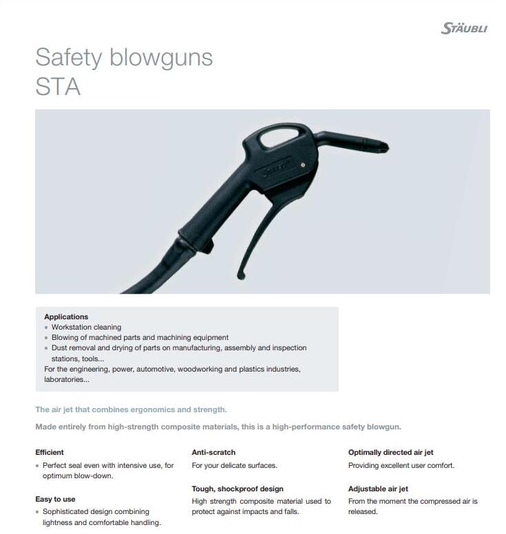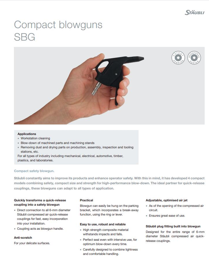 通过结合人体工程学设计、性能和耐用性,新型 SBG 空气吹尘枪令操作者的日常工作更轻松,无论身处哪个行业:机械、电气、汽车、制药、木料加工和塑料等等。 该二合一解决方案结构非常紧凑,可简便地连接到任何史陶比尔压缩空气连接件上。枪体和吹尘点的设计防止了刮擦脆弱表面的危险。借助可调节喷气,使用该压缩空气吹尘枪非常舒适。
