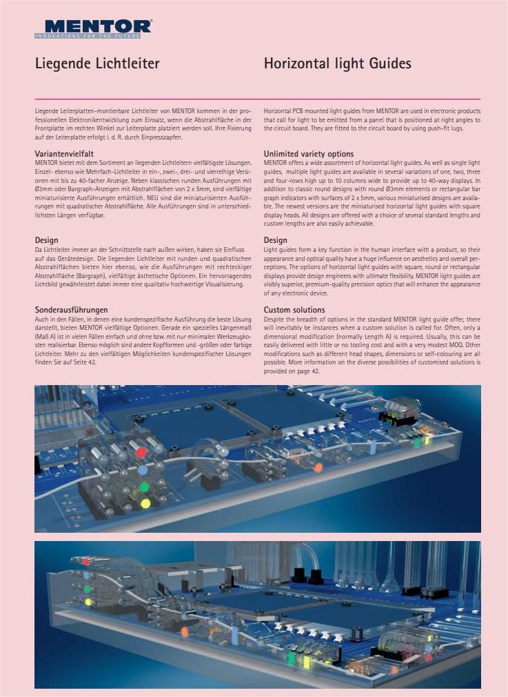 MENTOR为您提供广泛的光导,具有多种版本,适用于各种应用。它包括前面板安装解决方案,以及垂直或水平电路板安装版本、单个或多个光导、条形图显示、不同的头部形状、各种尺寸——包括微型版本和灵活的光导系统。