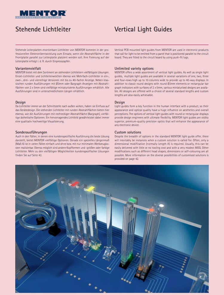 MENTOR为您提供广泛的光导,具有多种版本,适用于各种应用。它包括前面板安装解决方案,以及垂直或水平电路板安装版本、单个或多个光导、条形图显示、不同的头部形状、各种尺寸——包括微型版本和灵活的光导系统。