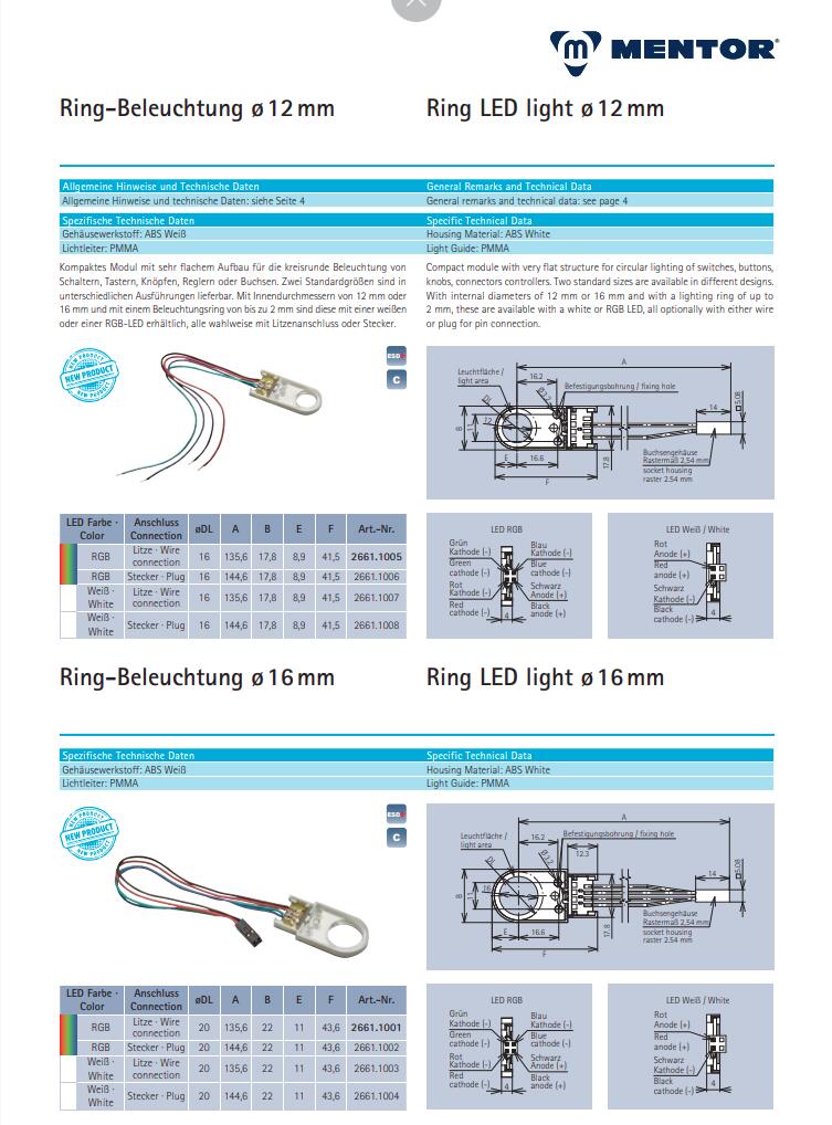 环形灯是紧凑的模块,具有非常扁平的设计,用于开关、按键、旋钮、控制器或插孔的圆形照明。它们有两种标准尺寸和不同的设计。这些环形灯的内径为 12 mm 或 16 mm,照明环最大为 2 mm,可提供白色或 RGB-LED,并可选择绞合线连接或插头。