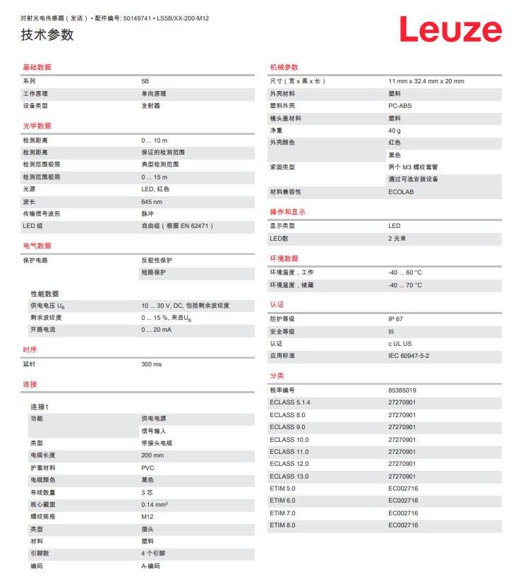 瑞士Leuze劳易测 对射式光电传感器LS5B/XX-200-M12产品详情: