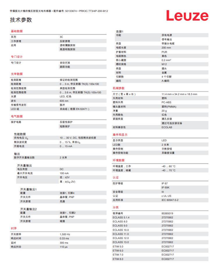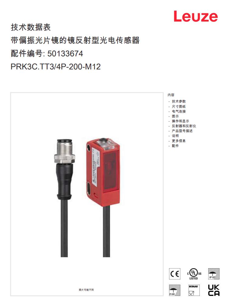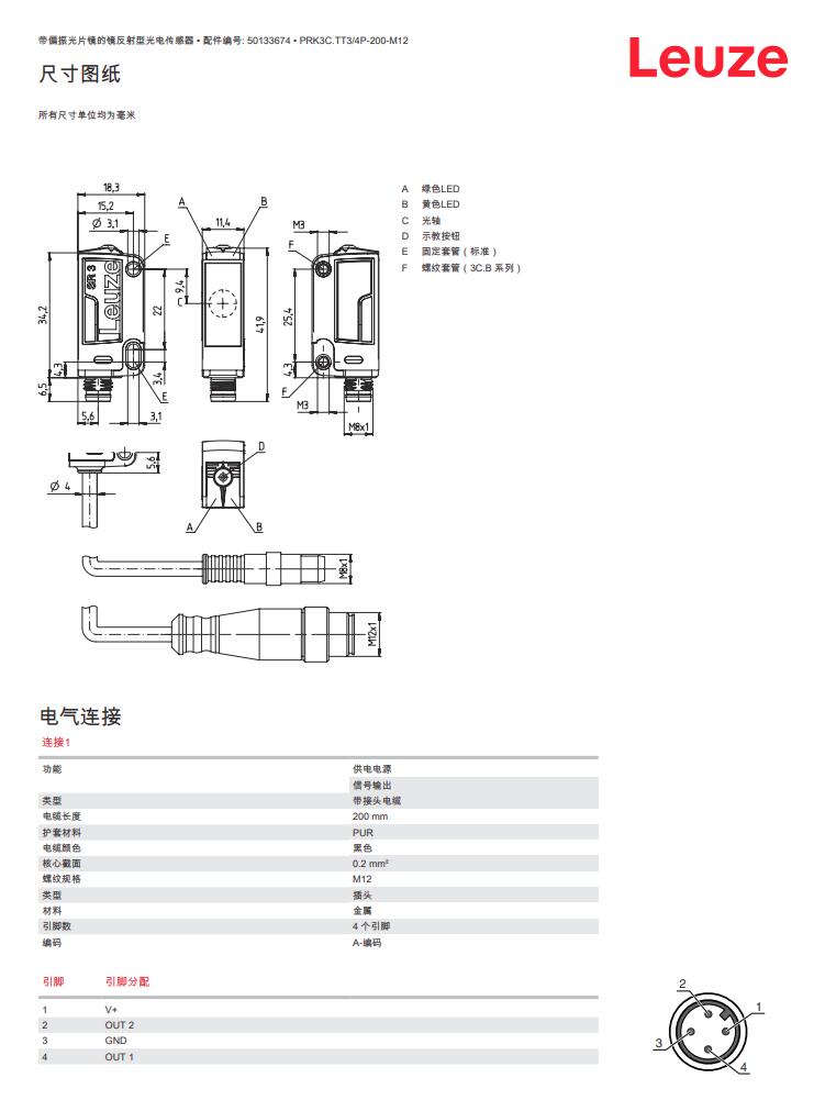 Leuze劳易测镜反射型光电传感器PRK3C.TT3/4P-200-M12产品详情: