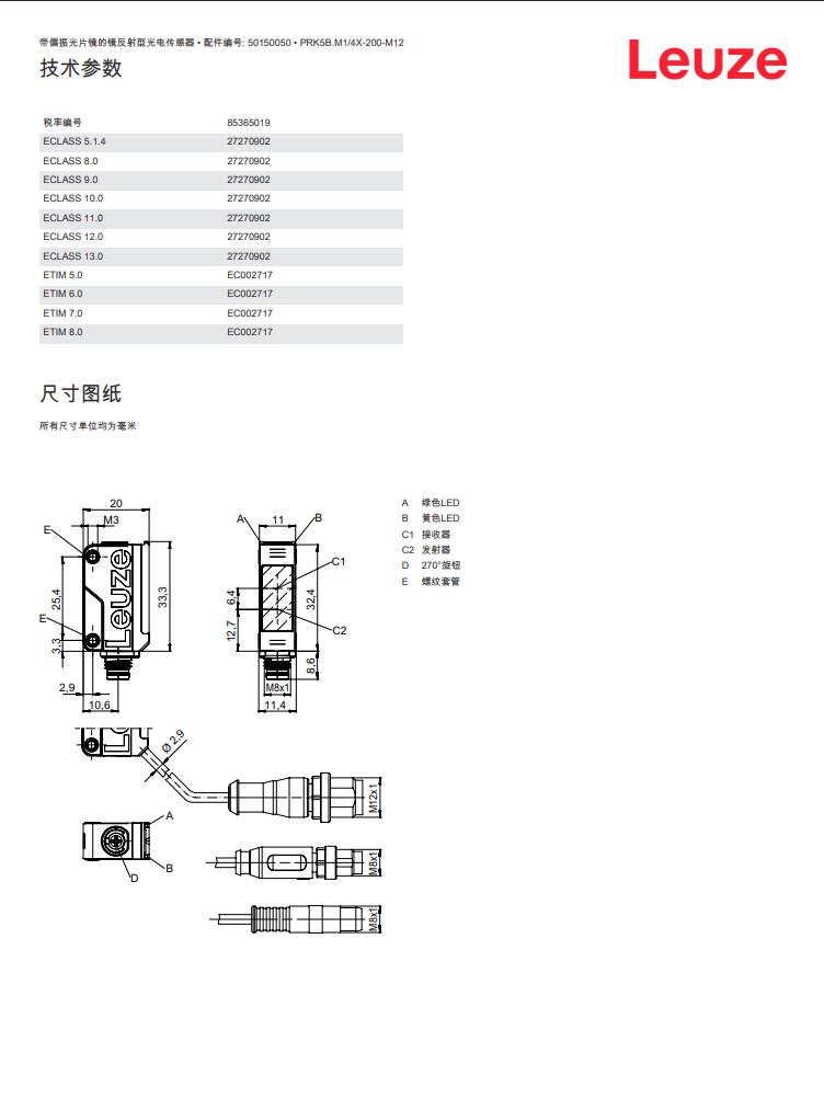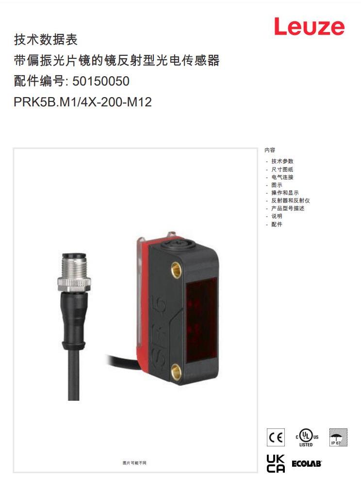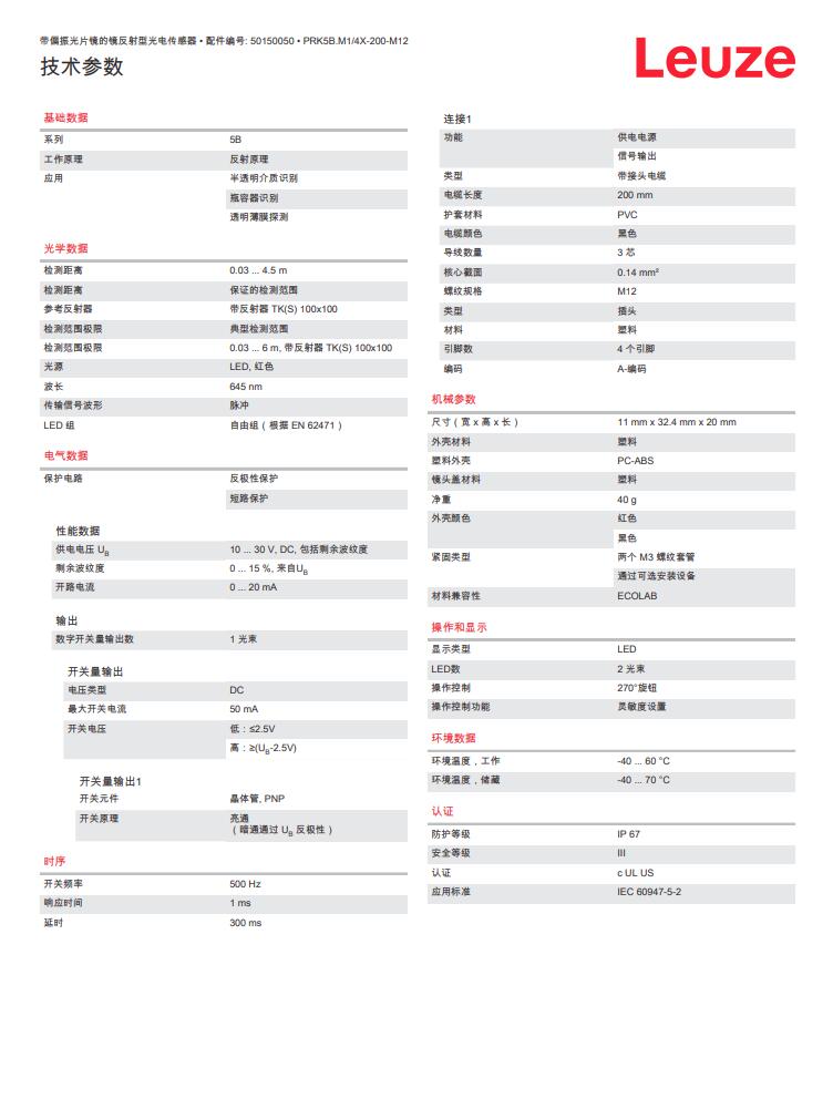 瑞士Leuze劳易测 镜反射型光电传感器PRK5B.M1/4X-200-M12产品详情: