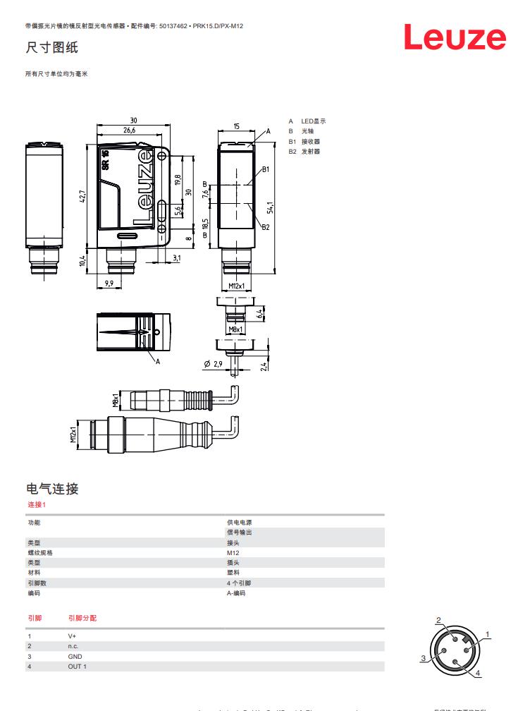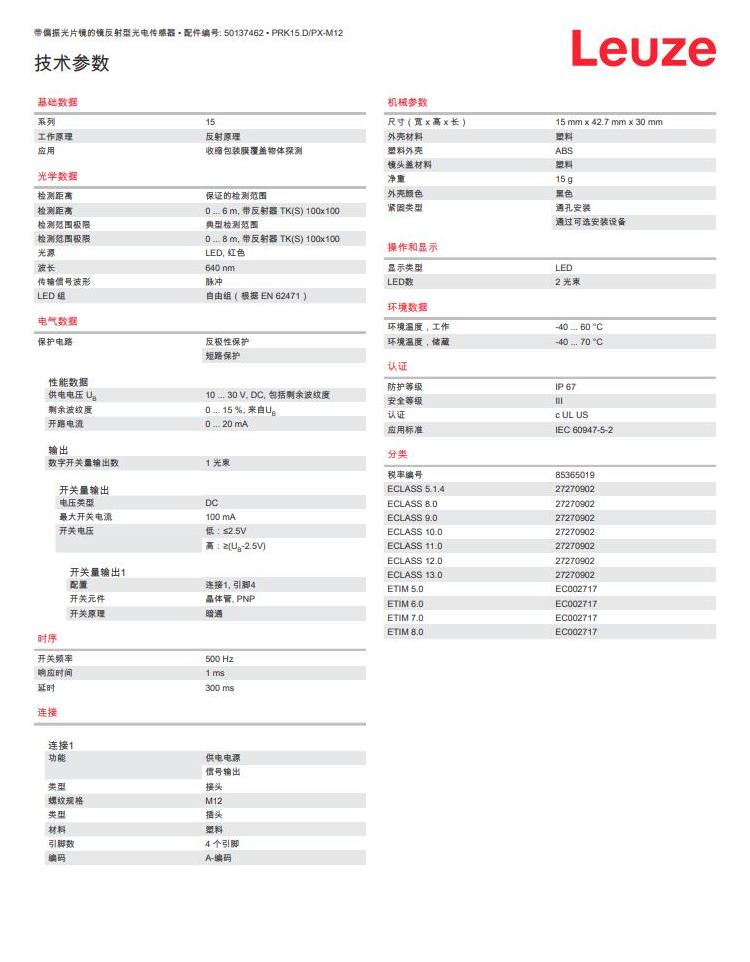 瑞士Leuze劳易测镜反射型光电传感器PRK15.D/PX-M12产品详情: