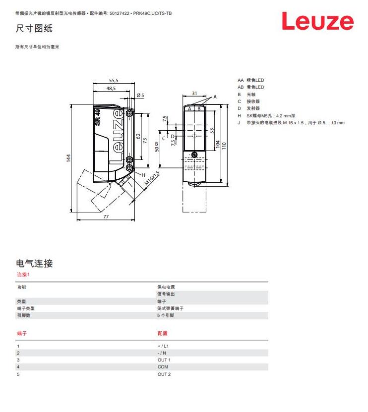 瑞士Leuze劳易测镜反射型光电传感器PRK49C.UC/TS-TB产品详情: