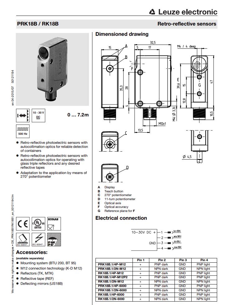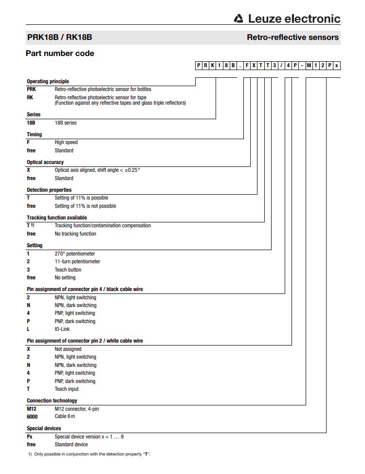 瑞士 Leuze劳易测 镜反射型光电传感器RK18B.1/2N-M12产品详情: