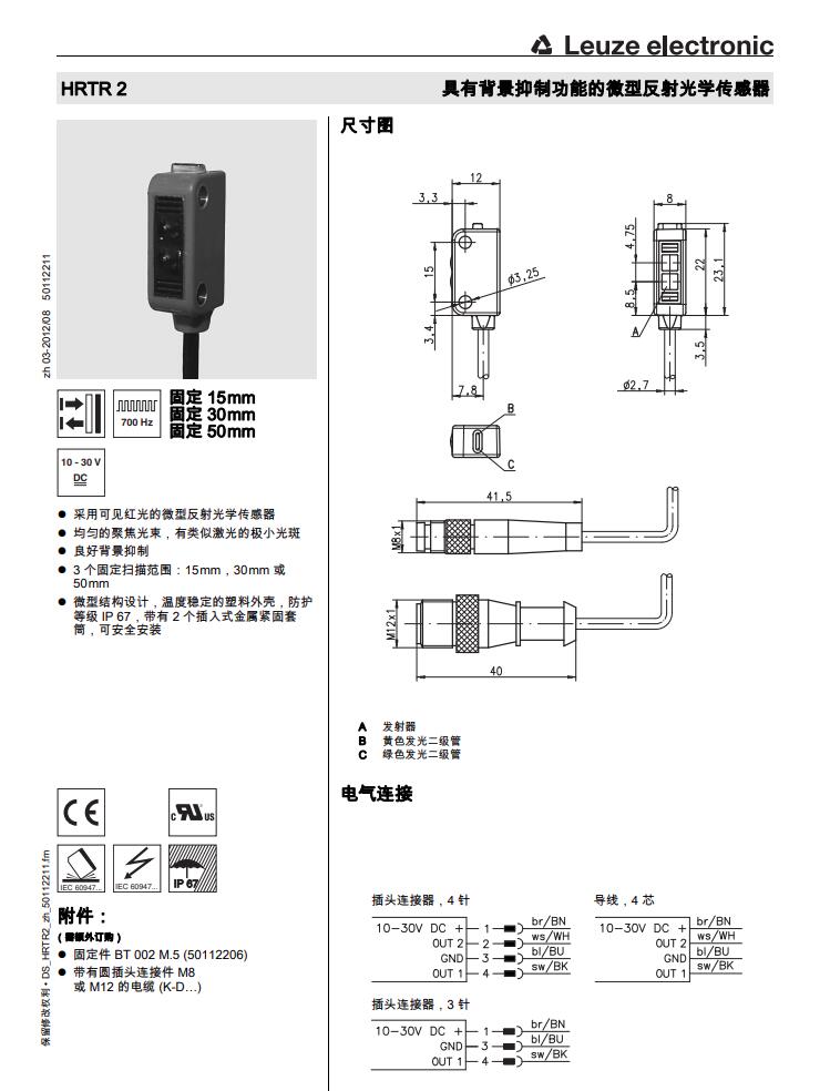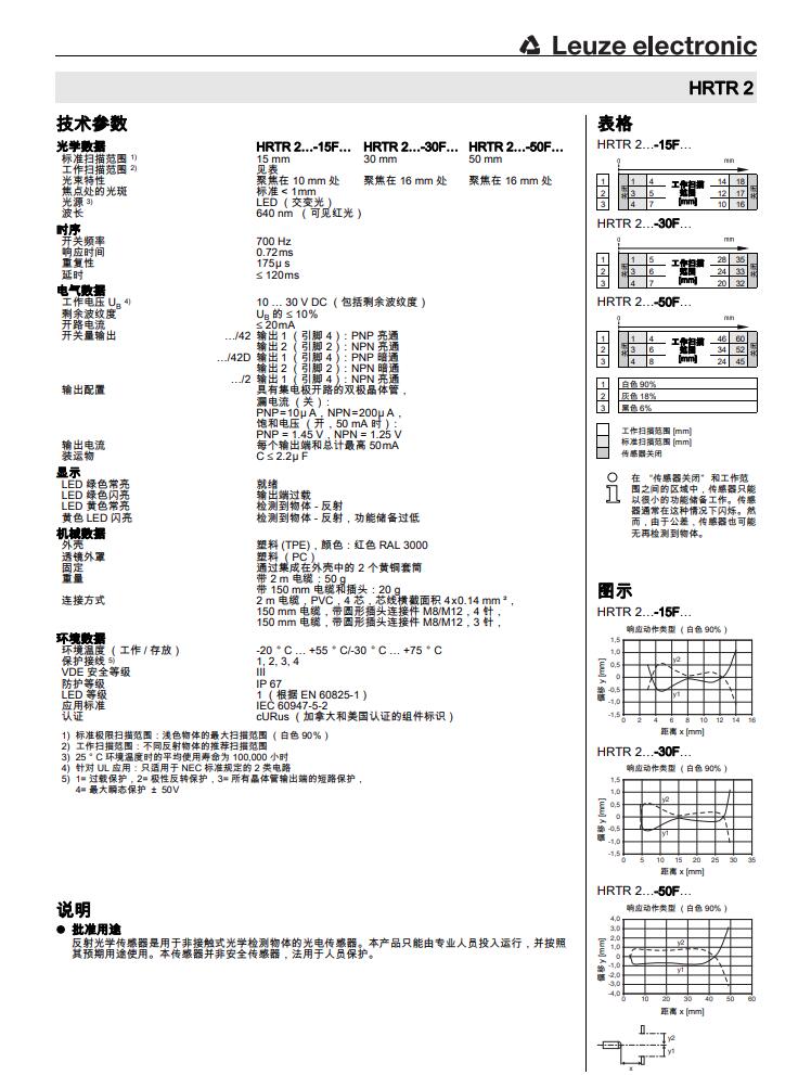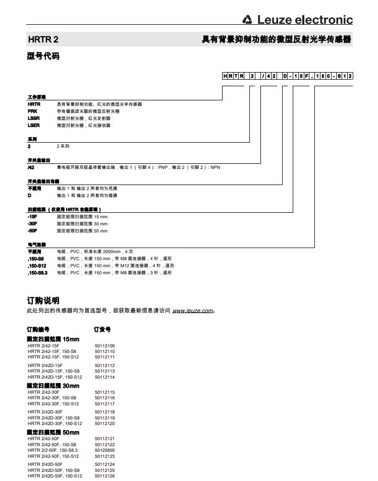 瑞士Leuze劳易测漫反射光电传感器HRTR 2/42-15F产品详情:
