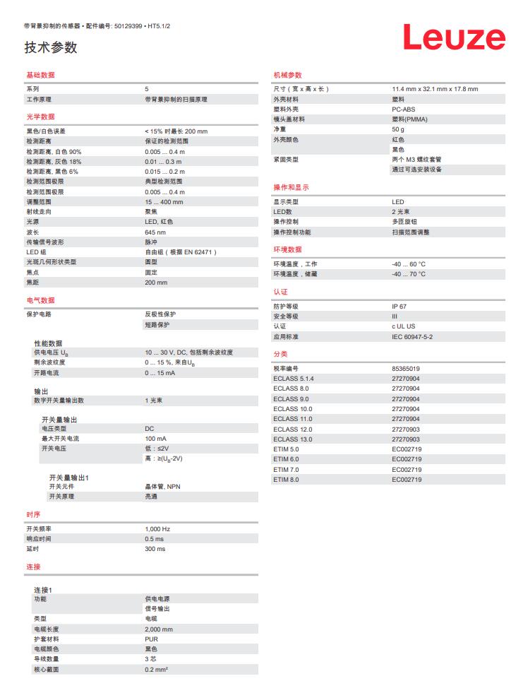 瑞士Leuze劳易测漫反射光电传感器HT5.1/2产品详情: