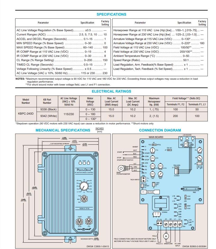 KBPW-240D直流驱动器是一款脉宽调制(PWM)控制装置,安装在NEMA 4X/IP 65冲洗/防水外壳中,适合室内或室外使用。它设计用于运行1/100至2马力的永磁和并联绕组电机。PWM提供高电机效率,静音运行以及更少的电机发热。这使得在大多数应用中可以使用更小、成本更低的电机。KBPW-240D的一个功能是其有源桥,可显著降低交流线路循环期间的交流线路浪涌电流。这允许快速打开和关闭控制,而不会损坏关键组件。有源电桥与故障保护电路耦合,如果主功率晶体管短路,该电路将关闭控制,从而防止危险的高速失控情况。通过定时电流限制电路(TCL)防止电机烧毁。该驱动器还具有自动抑制功能®,可在交流线路快速切换期间提供平稳、安全的启动。
