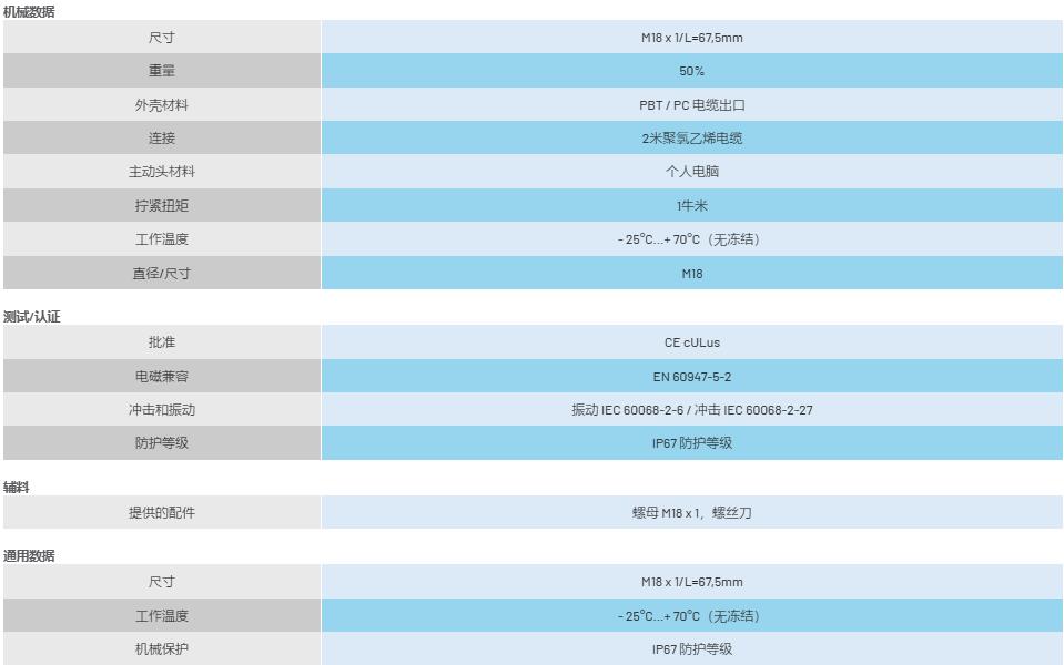 M18,光电传感器,漫反射型号可达1.5 m,偏振4.5 m,背景抑制高达250 mm,对射光束可达20 m,适用于透明物体。