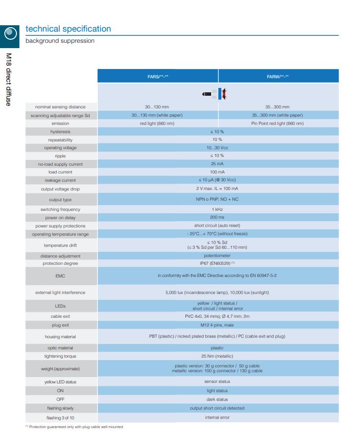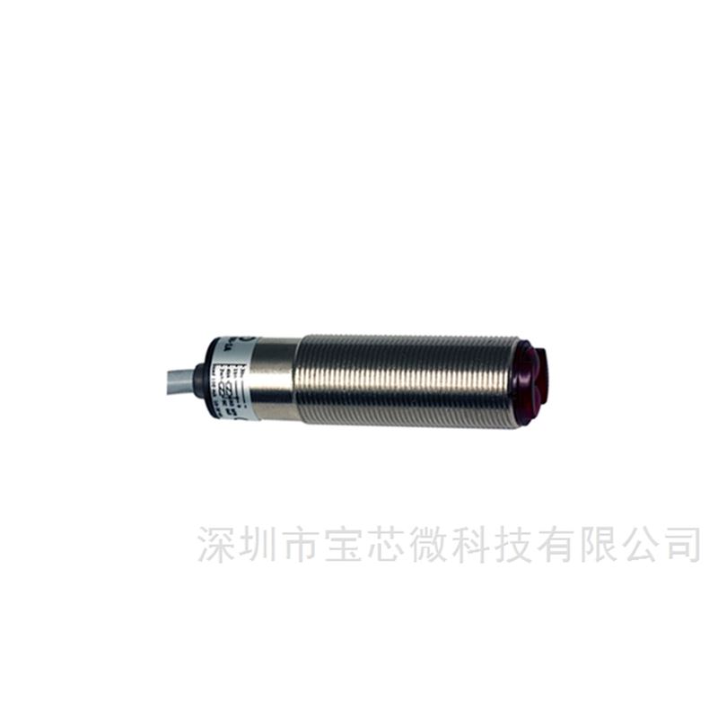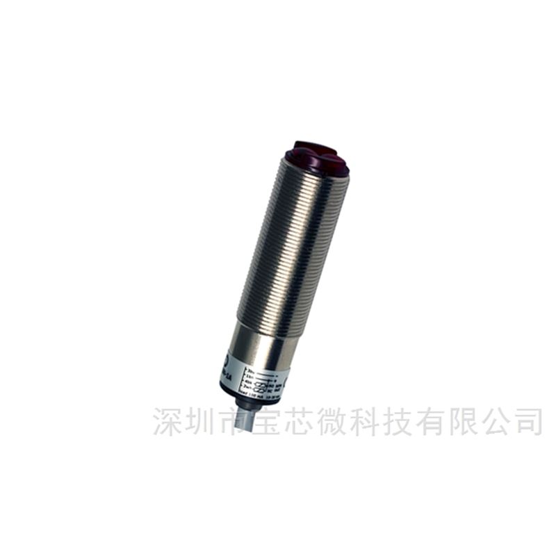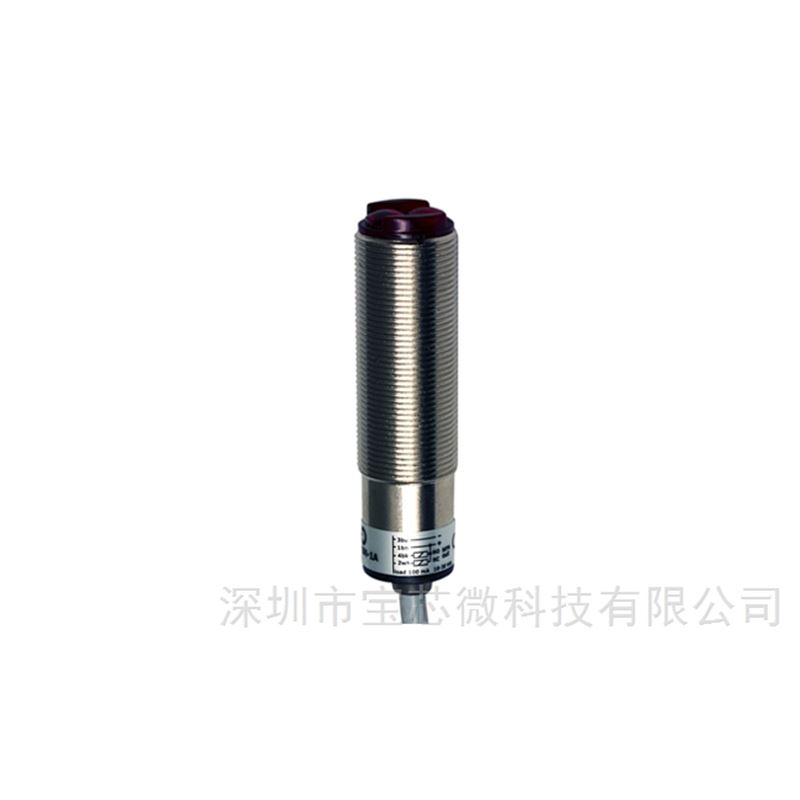 M18,光电传感器,漫反射型号可达1.5 m,偏振4.5 m,背景抑制高达250 mm,对射光束可达20 m,适用于透明物体。