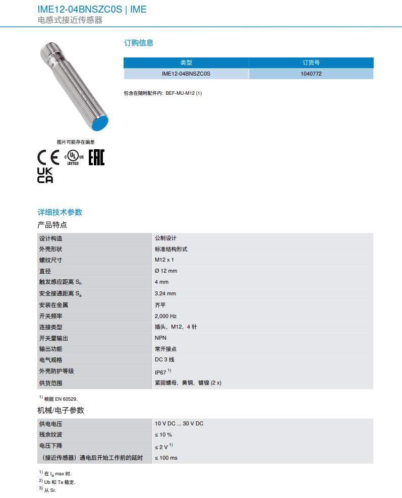 德国SICK西克 电感式接近传感器IME12系列IME12-04BNSZC0S产品详情: