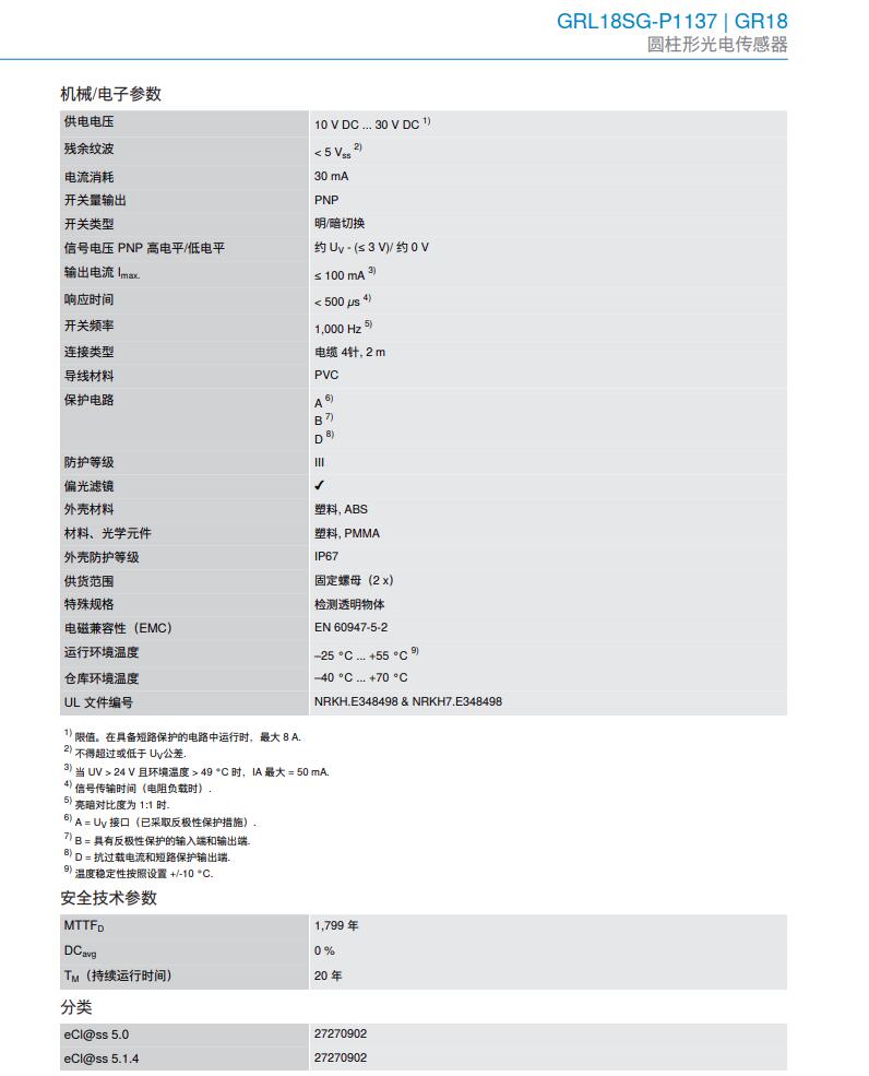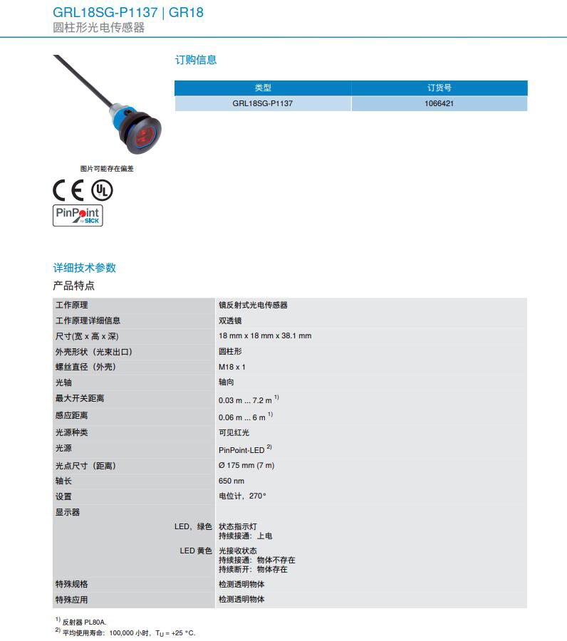 德国SICK西克镜反射式光电传感器GR18系列GRL18SG-P1137产品详情: