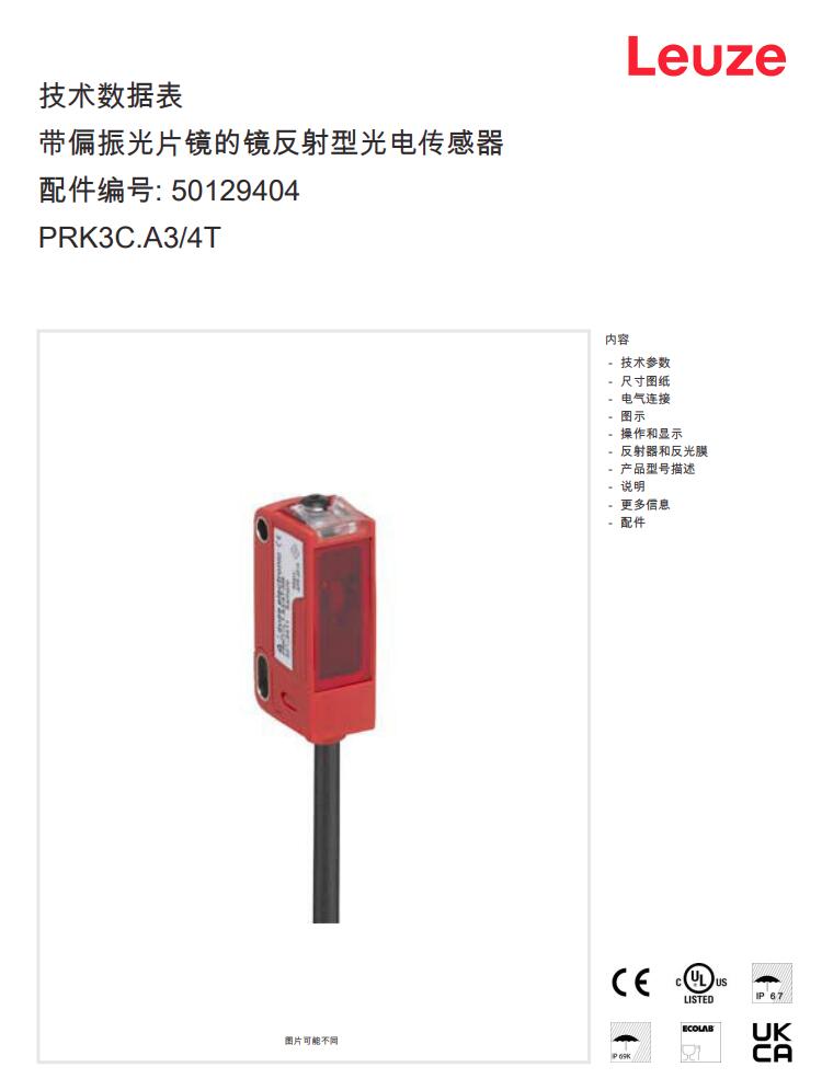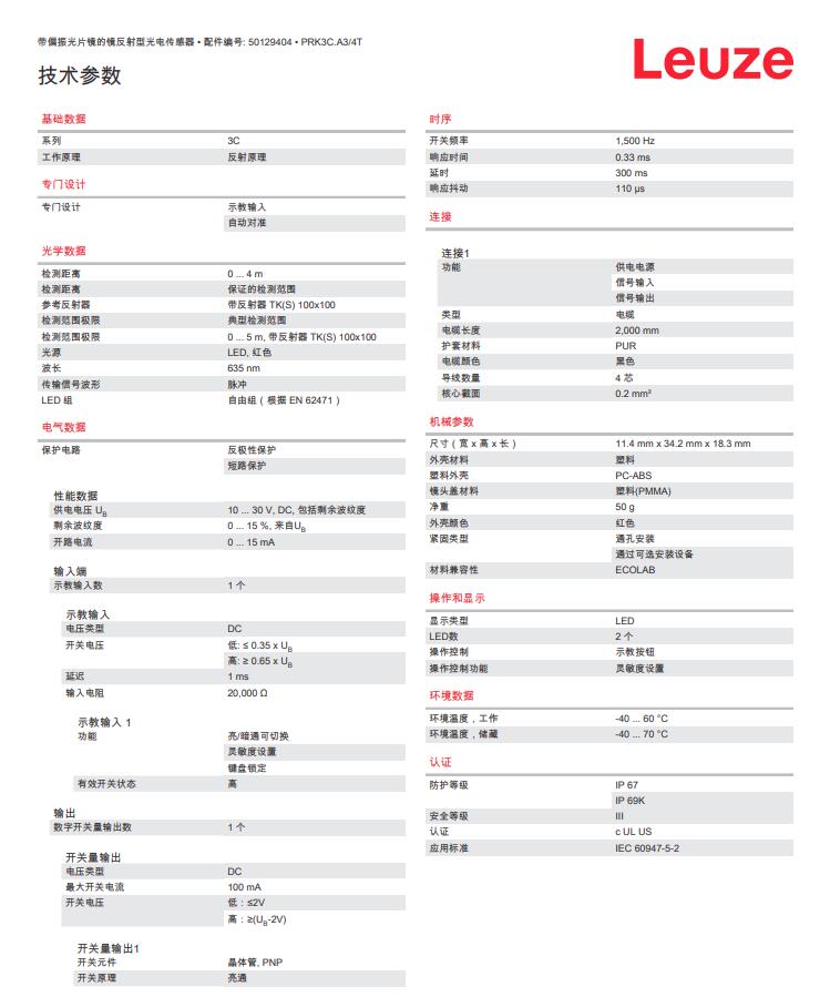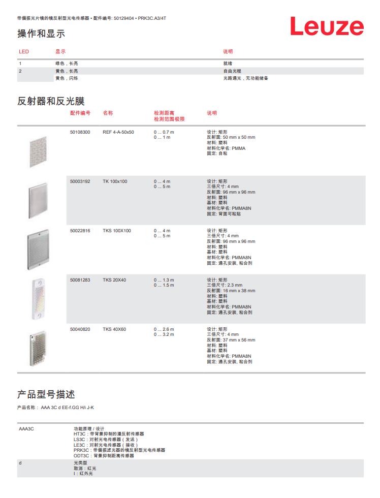 德国Leuze劳易测镜反射型光电传感器PRK3C.A3/4T产品详情:
