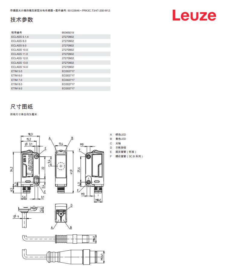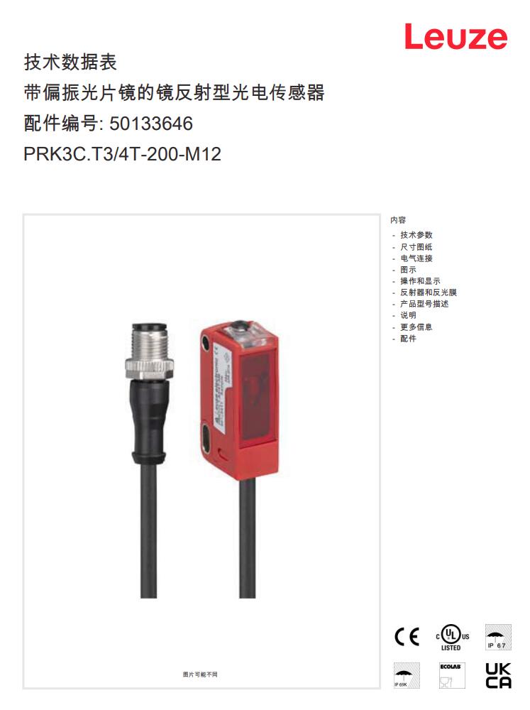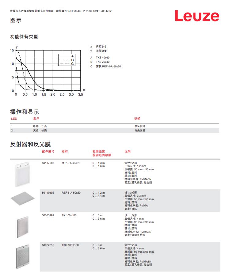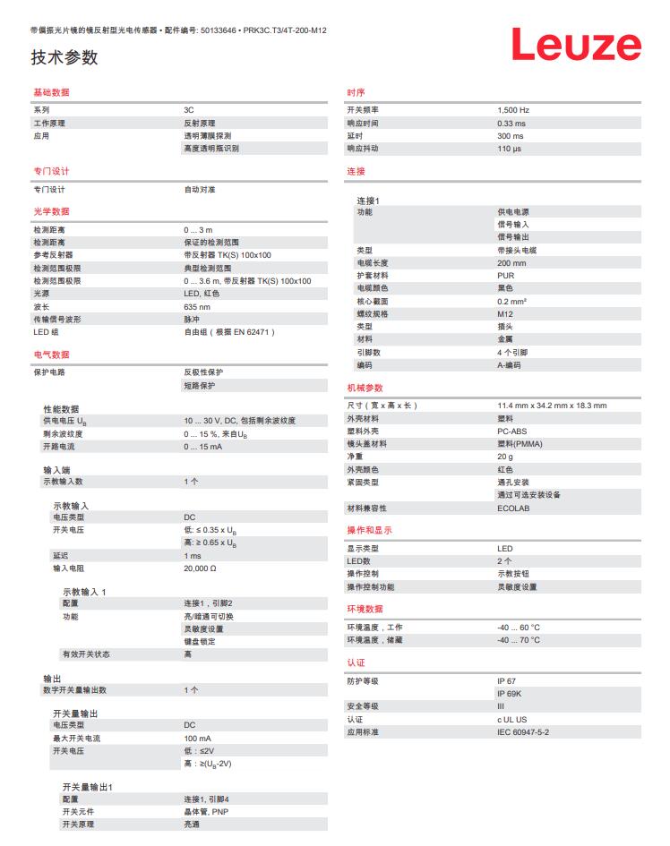 德国Leuze劳易测镜反射型光电传感器PRK3C.T3/4T-200-M12产品详情:
