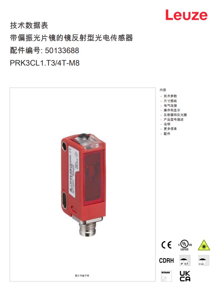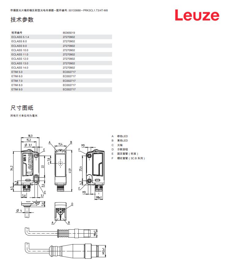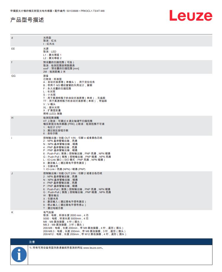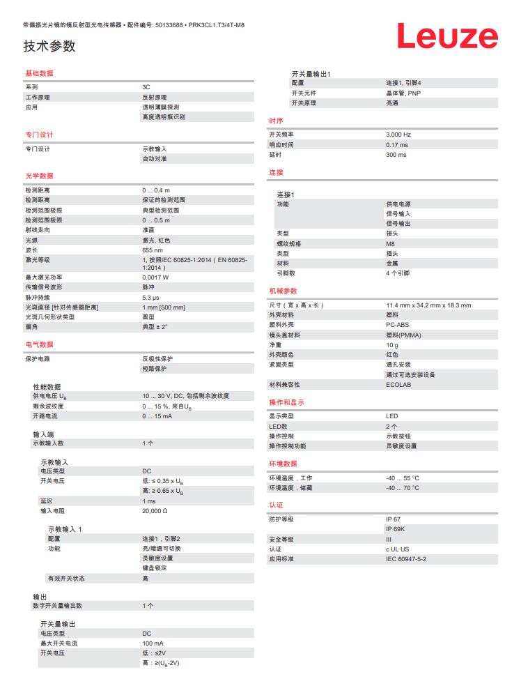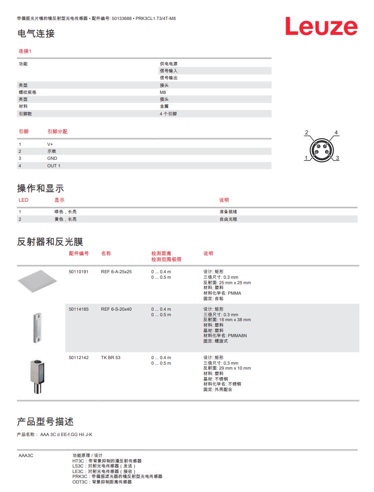 德国Leuze劳易测镜反射型光电传感器PRK3CL1.T3/4T-M8产品详情: