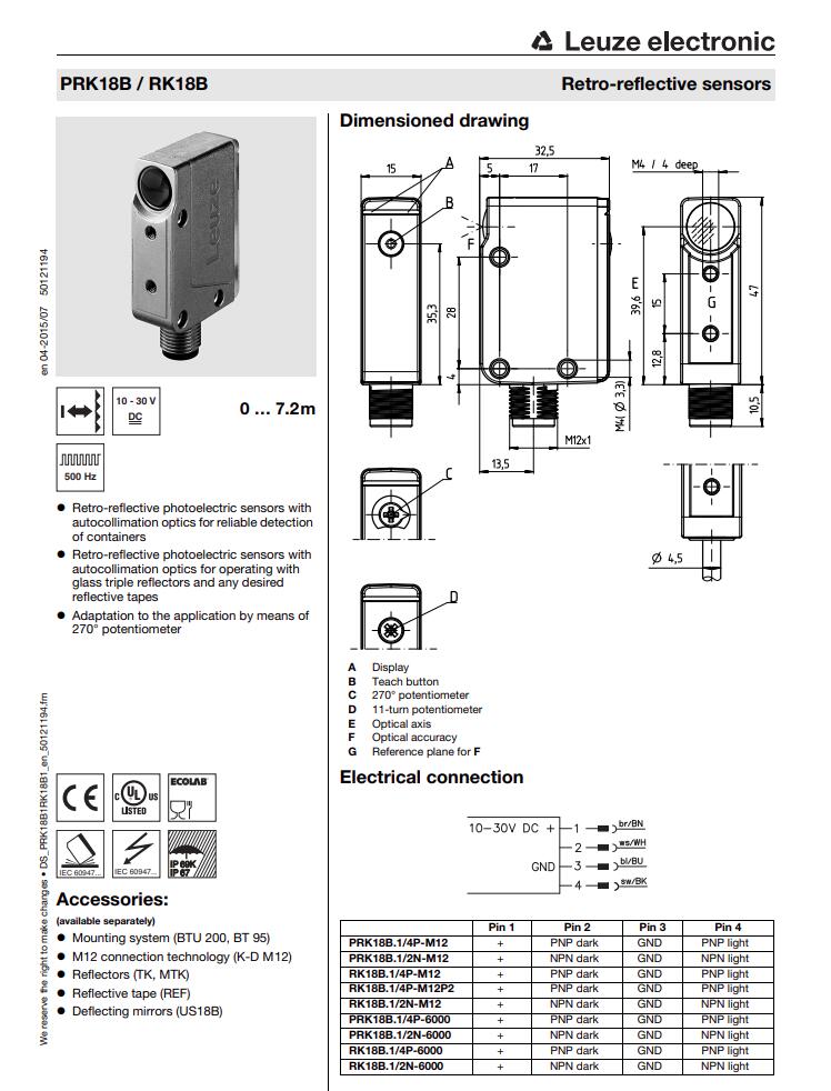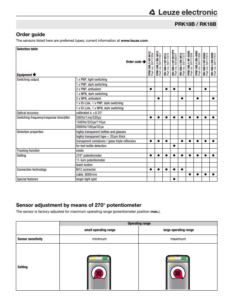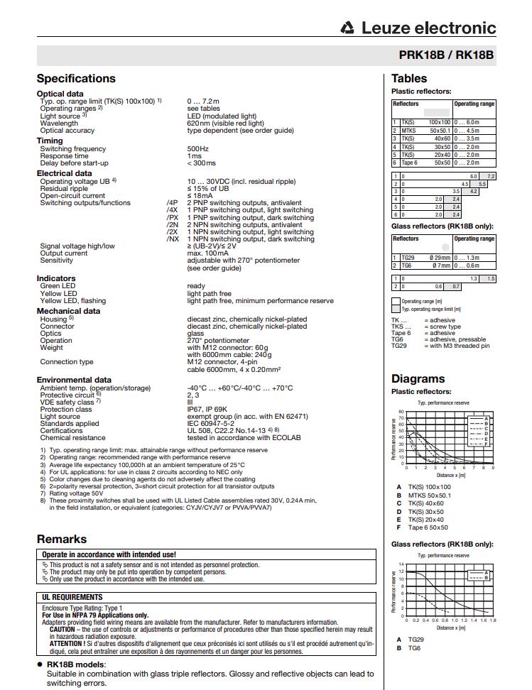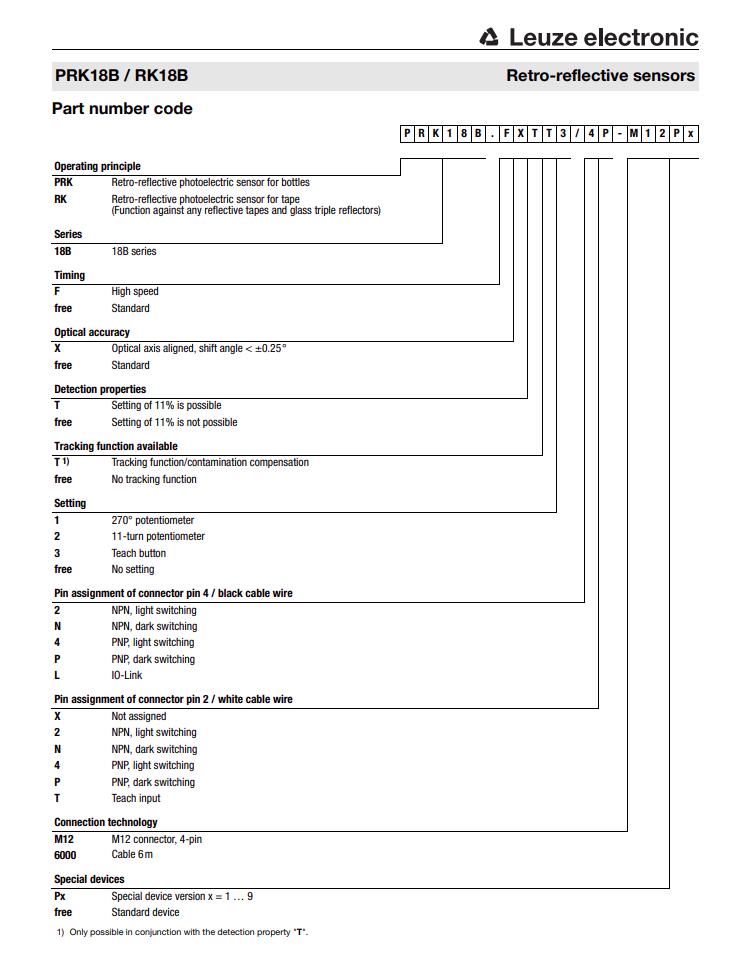 德国Leuze劳易测镜反射型光电传感器PRK18B.1/2N-M12产品详情: