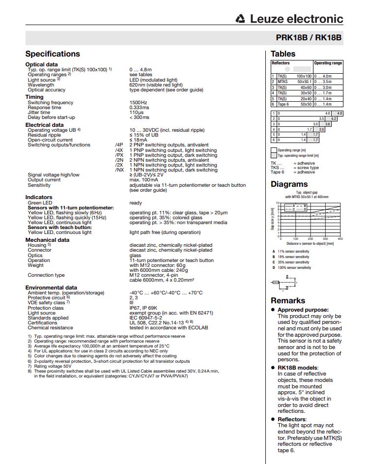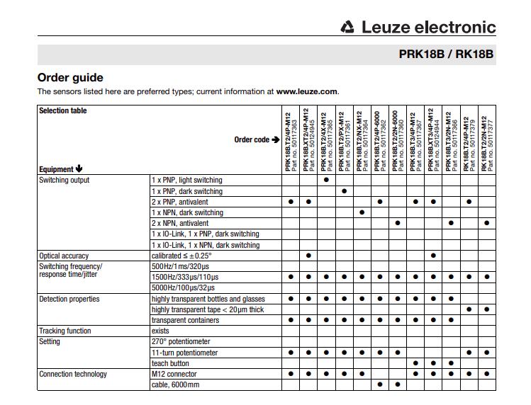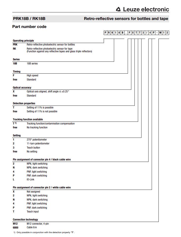 德国Leuze劳易测镜反射型光电传感器PRK18B.T2/PX-M12产品详情: